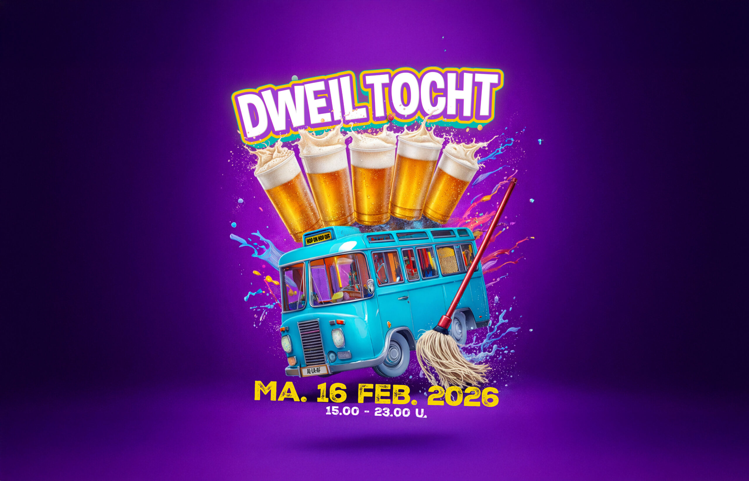 Tijdens de Dweiltocht 2026 ga je met de bus van kroeg naar kroeg en bepaal je zelf hoe jouw carnavalsmaandag eruitziet. Geen vaste tijden, geen verplichtingen. Gewoon muziek, gezelligheid en een goed glas bier.